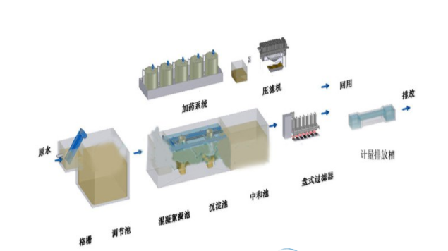 廢水從車間排放先經(jīng)過格柵去除大顆粒懸浮物質(zhì)后進(jìn)入調(diào)節(jié)池,調(diào)節(jié)水質(zhì)水量,然后由提升泵打入混凝池,通過投加藥劑進(jìn)行混凝反應(yīng),然后進(jìn)入絮凝池,投加絮凝劑進(jìn)行絮凝反應(yīng),后進(jìn)入沉淀池進(jìn)行固液分離,上清液進(jìn)入中間水池,然后進(jìn)入水解酸化和好氧生物處理,后進(jìn)入二沉池進(jìn)行固液分離,上清液進(jìn)入排放水池,然后經(jīng)計量排放槽計量排放。